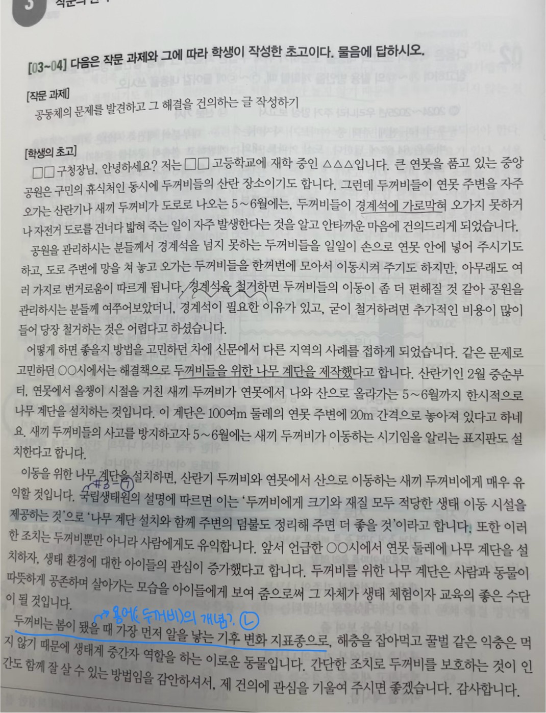 지문에 표시된 파란색 밑줄처럼 ㄴ에서의 용어정리 (=두꺼비) 에 해당되고, ㅁ에서의 문제의 영향이 집중되는 특정단체 (=즉 경계석때문에 영향받는 산란기/새끼 두꺼비들) 로 볼 수 있는거 아닌가요ㅜㅜ