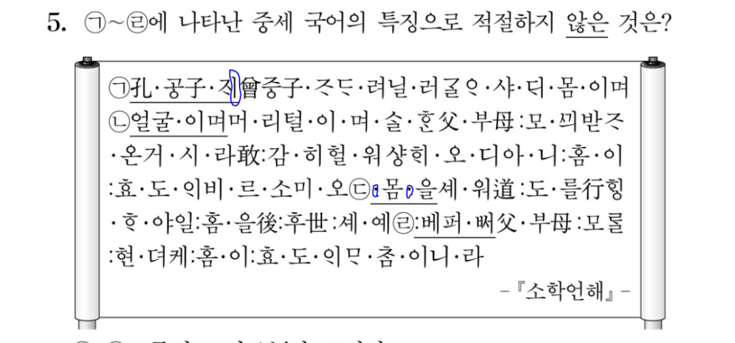 [선택지 ①] 상단 첨부 개념(주격조사)을 보면, 'ㅣ'가 아닌 모음으로 끝나는 단어 뒤에 주격조사를 붙이고 싶으면, 'ㅣ'를 붙이면 됩니다. 따라서 공자는 'ㅏ'(아래 아)로 끝나기에(즉, 'ㅣ'가 아닌 모음으로 끝나기에) 'ㅏ'(아래 아) 뒤에 'ㅣ'를 붙여서 주격조사를 써 준 것입니다. (ㄱ의 파란색 동그라미)