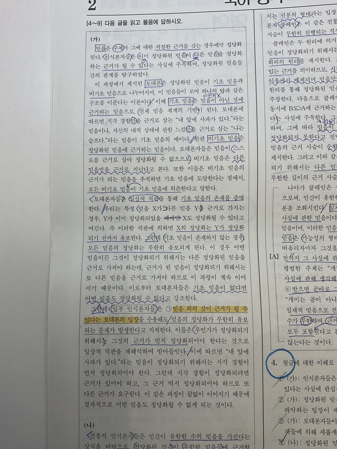 1. ㄱ에 친 노란색 밑줄부분에서 토대론은 믿음만이 믿음의 근거가 될 수 있다고 보는 입장 아닌가요? 왜 믿음 이외의 것이 근거가 될 수 있다고 하는지 잘 모르겠습니다