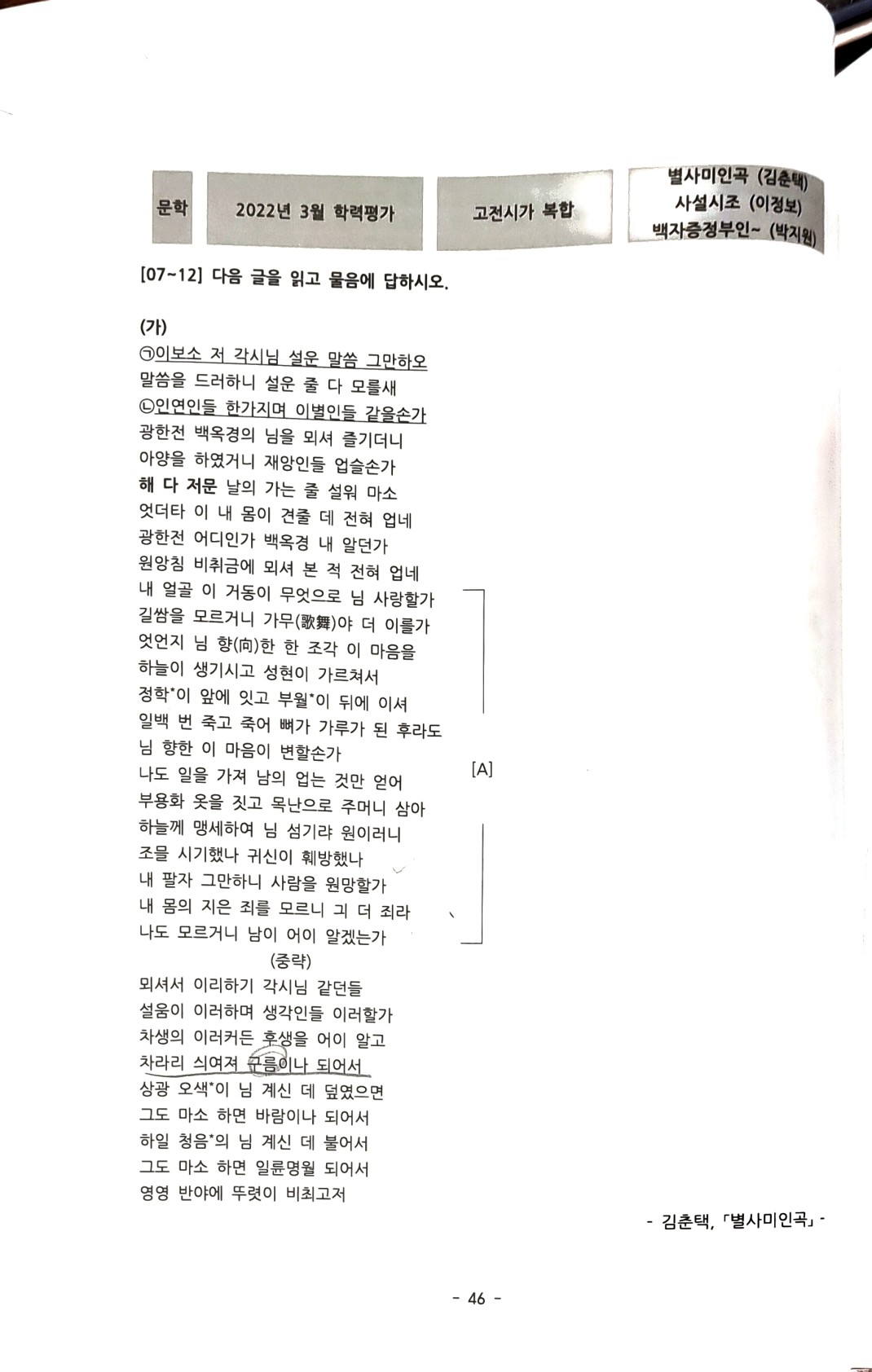 (답변) 이 부분은 [하늘께 맹세하야 임을 섬기는 것이 소원인데, 조물주가 시기했는지 귀신이 훼방했는지 모르겠다. 이게 내 팔자인 듯 하니 다른 사람을 원망하겠느냐. 내 몸의 지은 죄를 모르는 것 그것이 더 죄 같다. 나도 모르는데 남들이야 알겠는가] 로 해석이 됩니다. 아마 9번 문제에서 ②번 선택지를 고른 것 같은데, [자신이 아무런 죄 없이 참소] 즉 '모함' 당했다는 언급이 없기에 해당 선택지는 답이 될 수 없습니다.