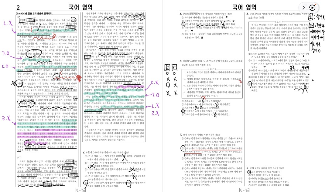 특히, 6번 문제에 대한 본문 근거를 보라색 펜과 연두색 형광펜으로 표시해 두었습니다.
