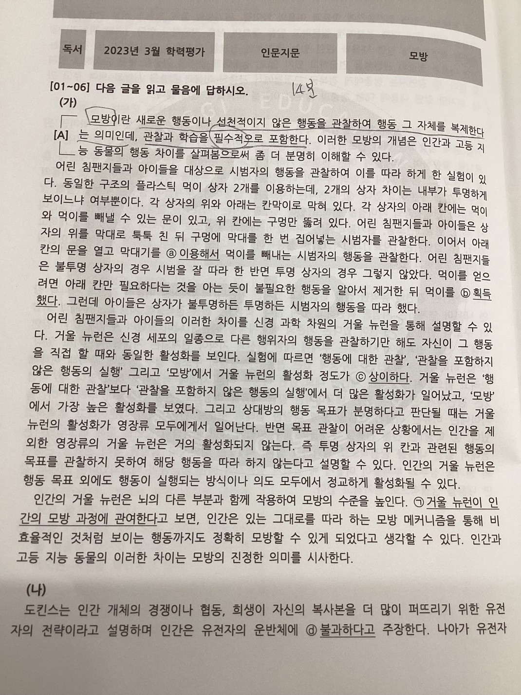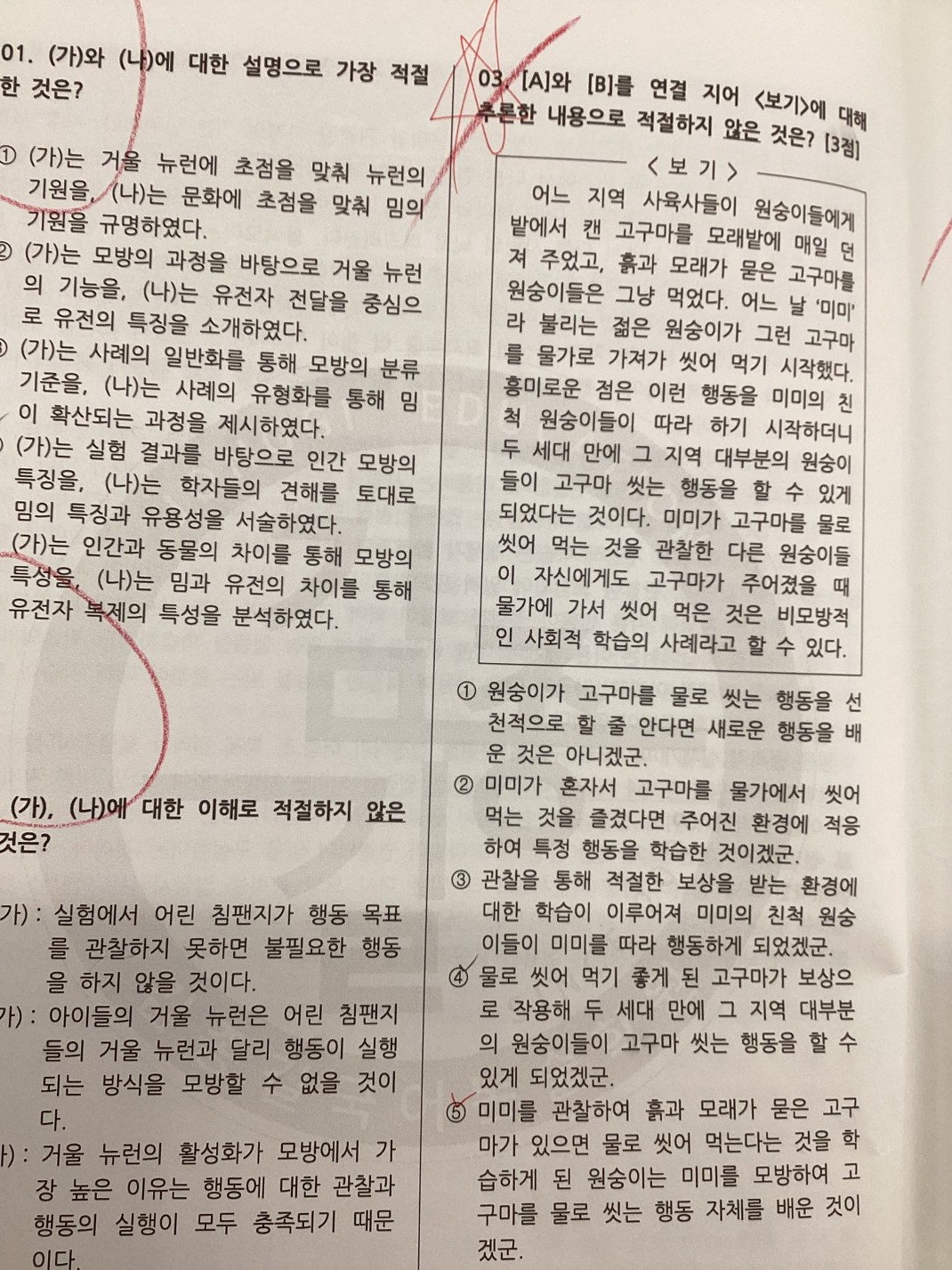 따라서, 5번 선지에서 '미미를 모방하여 고구마를 물로 씻는 행동' "자체"를 배운 것은 아닙니다.