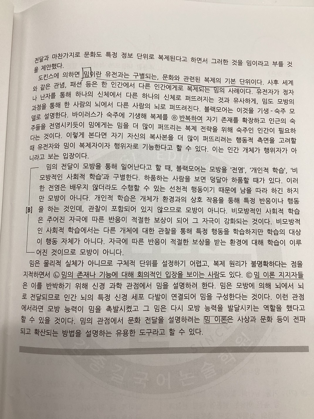 [B]에서 '비모방적인 사회적 학습'은 주어진 자극에 다른 반응이 적절한 보상이 되어 그 자극이 강화되는 것으로, 다른 개체에 대한 관찰을 통해 특정 행동을 학습하지만 학습의 대상이 행동 자체가 아니라, "자극에 따른 반응이 적절한 보상을 받는 환경"에 대해 학습이 이루어진 것으로, 모방이 아니라고 하였습니다.