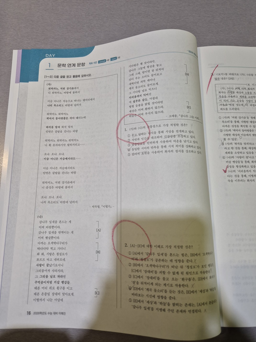 따라서 5. (나)의 '서러움까지 익어'서 마침내 '짙푸른 감'으로 변화한다 라는 부분이 틀렸습니다. 서러움이 익어서 짙푸른 감으로 변화하는게 아니라, 짙푸른 감의 상태에서 서러움이 익어 형형 등불을 밝히는 감이 되는 것이기 때문입니다.