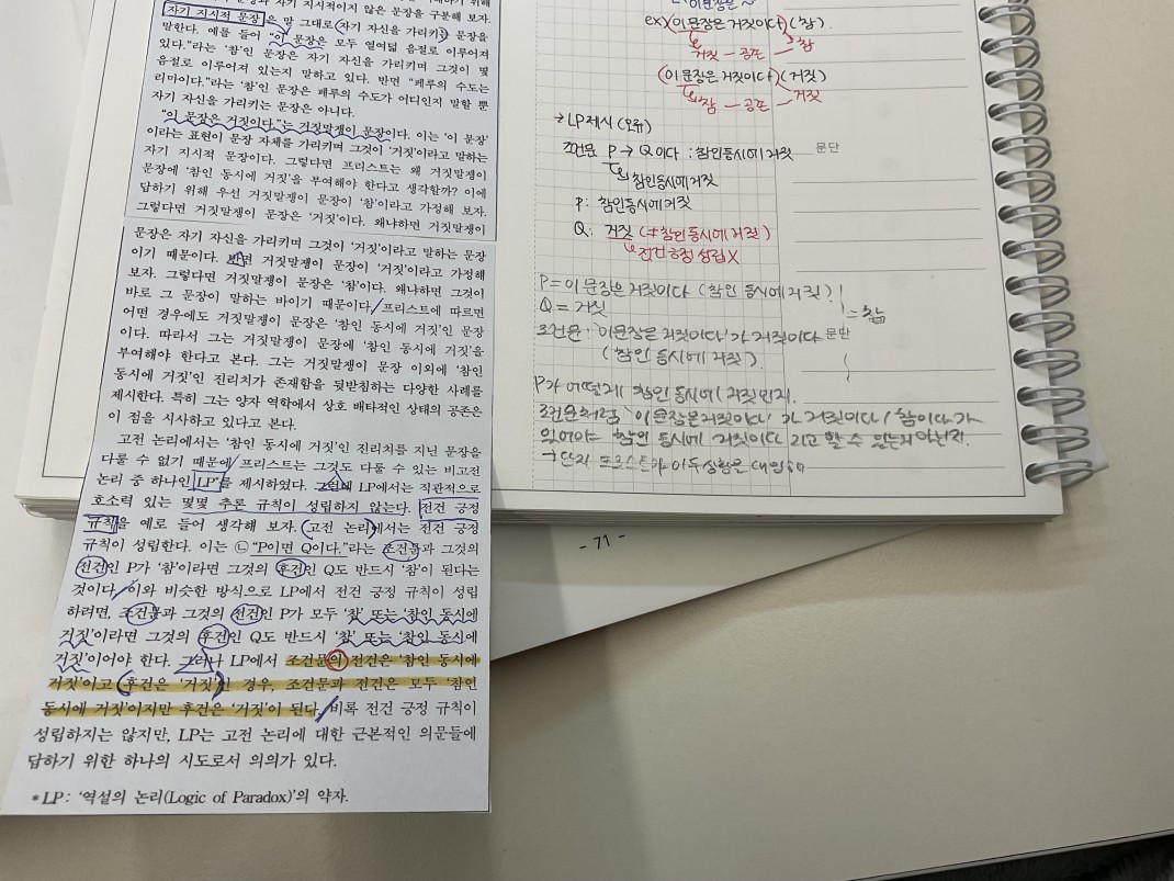 ④ 그렇다면, 전건긍정규칙이 성립하려면 [결론]도 ‘참인 동시에 거짓’으로 통일되어야 하는데, ②에서 이미 Q를 ‘거짓’으로 전제하였음. 따라서 결론인 Q가 ‘거짓’이 나오므로, 즉 전건(P)이 거짓으로 ‘부정’되므로, ‘전건긍정’규칙이 불성립함.