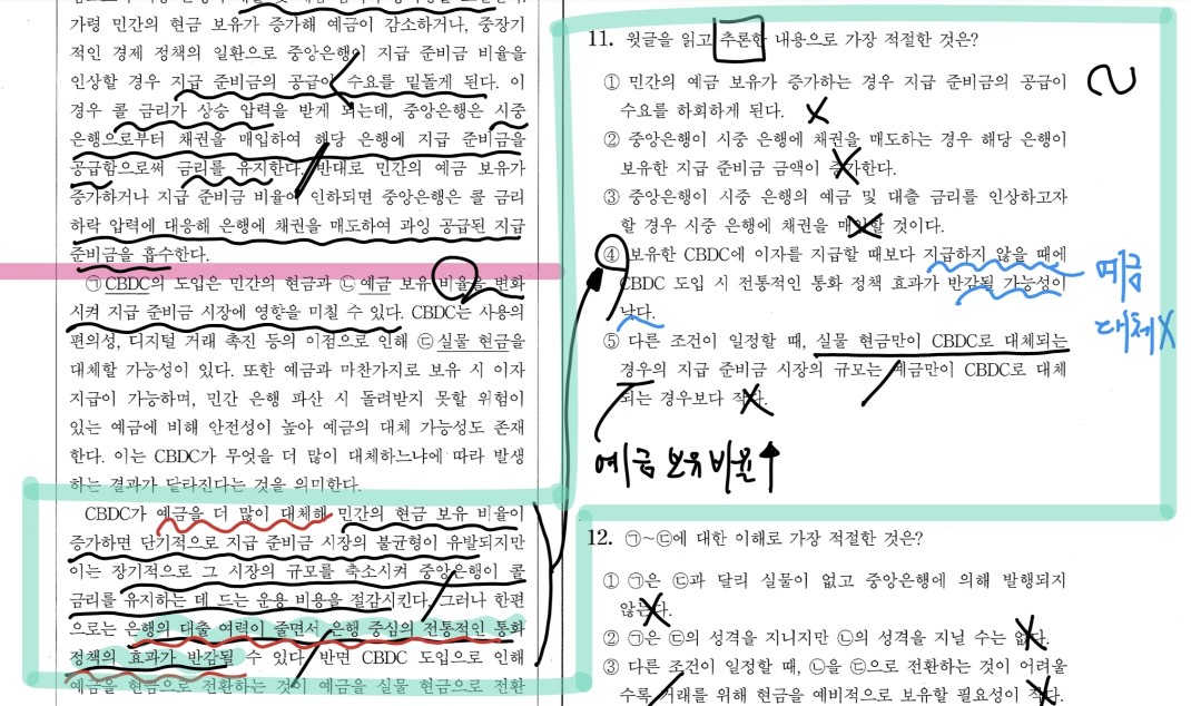 11번의 정답인 4번 선택지는, [CBDC에 이자를 지급하지 않을 경우]를 들고 있는데, 이때 이자 지급이 안되므로 사람들이 해당 CBDC를 은행에 저축하지 않을 것입니다. 즉 4번 선택지의 파란 밑줄과 필기처럼, CBDC가 예금을 대체하지 않게 됩니다. 그렇다면 [기존의 예금이 그대로 있으므로, 은행의 대출 여력에도 문제가 없고], 따라서 기존의 전통적인 통화 정책 효과가 반감되지도 않을 것입니다.