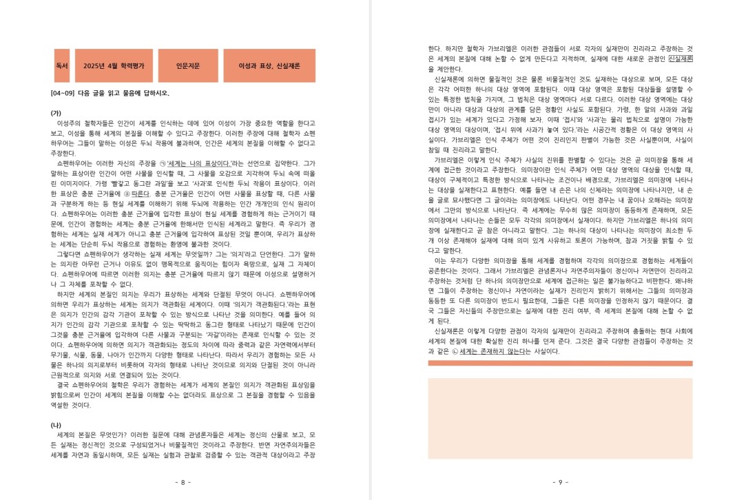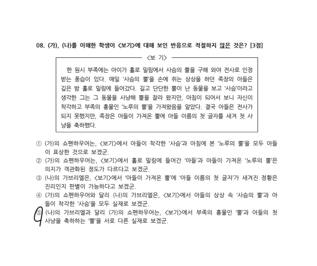 다시 정리하자면, 5번 선지가 틀린 이유는 1. (가) 쇼펜하우어 입장에서 둘 다 실재가 아님, 2. (나) 가브리엘의 입장에서 둘 다 서로 다른 실재임 이기 때문입니다.